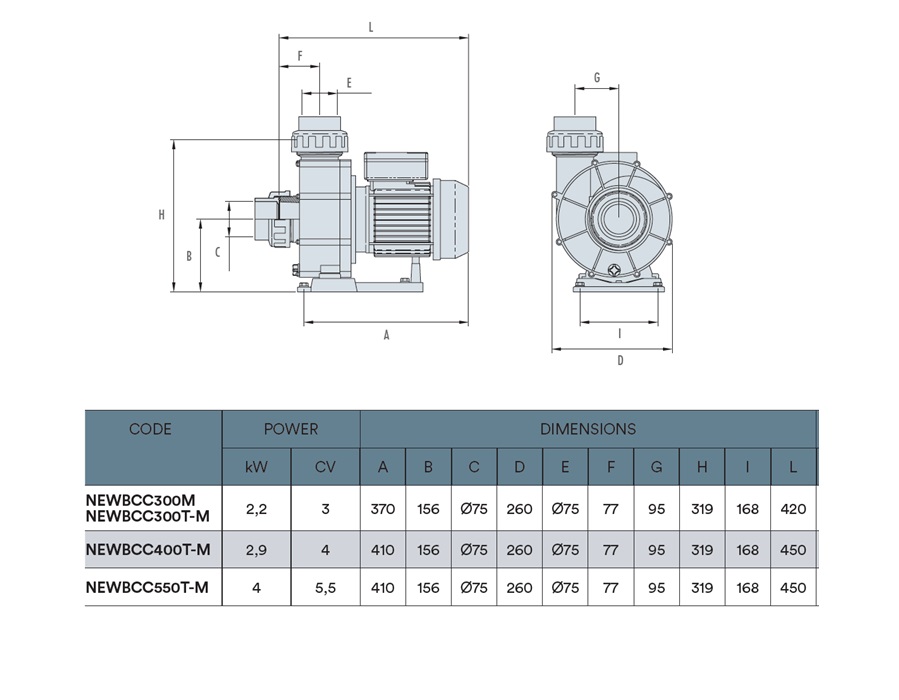 - Μονοφασικοί κινητήρες 3CV στα 230V-50Hz ή τριφασικοί κινητήρες 3HP, 4HP ή 5,5HP στα 230/400V-50Hz, όλοι στις 2.850 r.p.m. και προστασία IP-55.