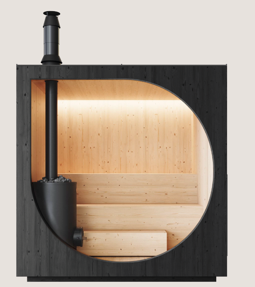 Οι εσωτερικοί τοίχοι και οι πάγκοι της σάουνας (για 1 έως 5 άτομα) διαθέτουν ουδέτερο κερί σάουνας, ενώ το δάπεδο επεξεργάζεται με λάδι δαπέδου. Ο τοίχος του παραθύρου είναι χρωματισμένος για να ταιριάζει με τους εξωτερικούς τοίχους, πόρτα από CLT με κλειδαριά και με μακριά μαύρη λαβή μάνταλο με ρολό.